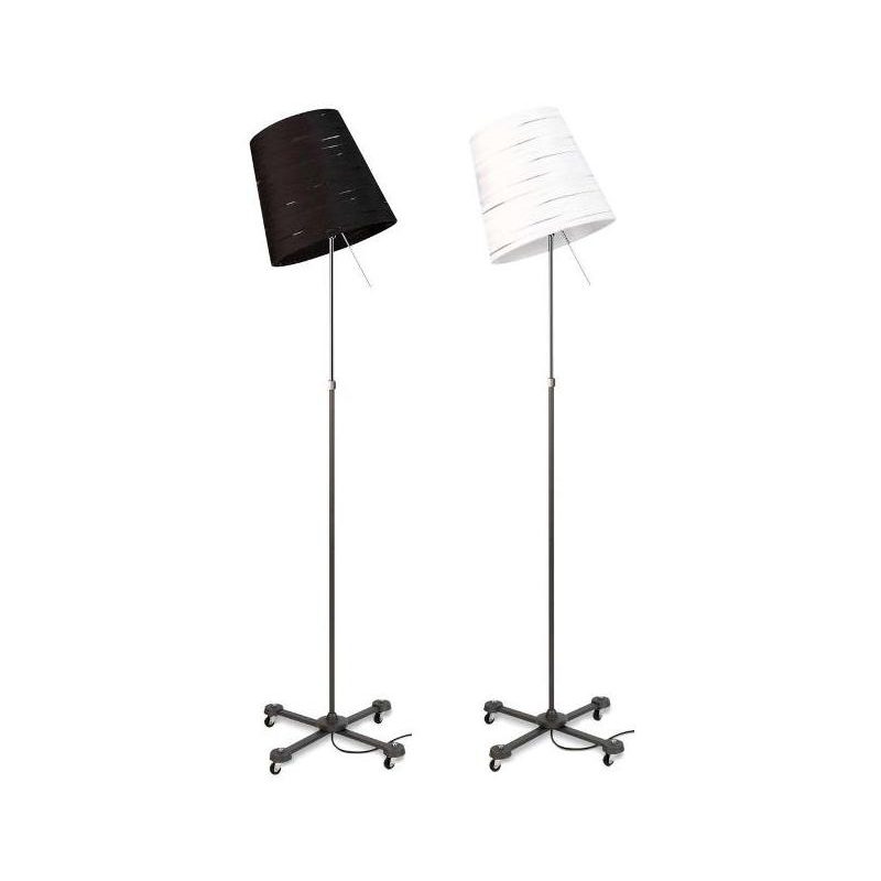 Detalle: Pantalla móvil con movimiento de ladeo, mástil telescópico y rueditas para desplazar la lámpara por el ambiente.